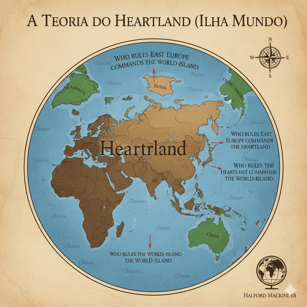 Mackinder enxergava o mundo como dividido entre três grandes áreas: a Ilha-Mundo (que seria a Eurásia e a África), as Ilhas Marginais (como o Reino Unido e o Japão) e o resto do mundo. No centro da Ilha-Mundo estava o Heartland, uma região vasta e de difícil acesso por mar, o que a tornava menos vulnerável a invasões marítimas, comuns naquela época. A partir dessa base sólida, um poder terrestre poderia expandir sua influência para dominar o restante da Ilha-Mundo e, por fim, o globo.