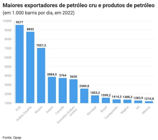 Quando olho para este ranking dos maiores exportadores de petróleo em 2022, a ausência da Venezuela é gritante. Os Estados Unidos lideram com 9,5 milhões de barris por dia. Arábia Saudita exporta 8,8 milhões. Rússia, 7 milhões. A Venezuela? Nem aparece entre os dez maiores, quando deveria estar disputando o topo desse ranking.