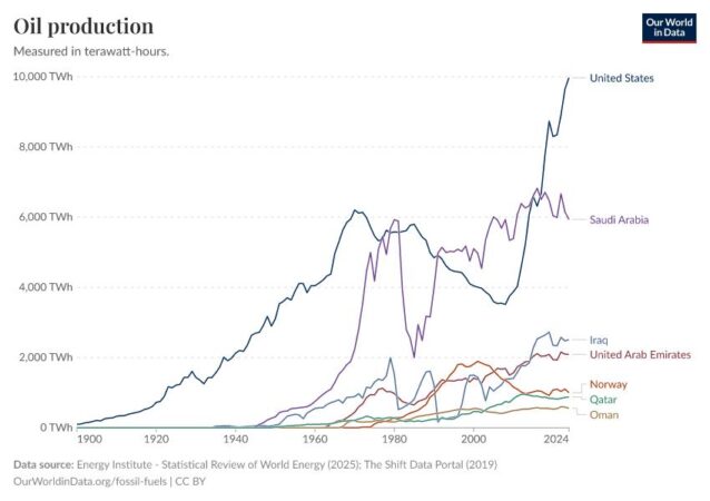 Neste gráfico de produção mundial, vejo uma história de ascensão e queda. Os Estados Unidos dispararam a partir de 2010 graças à revolução do shale oil. A Arábia Saudita se mantém como potência estável. O Iraque se recupera lentamente de décadas de conflito. E a Venezuela? Mal aparece no gráfico, reduzida a uma linha fina e insignificante.